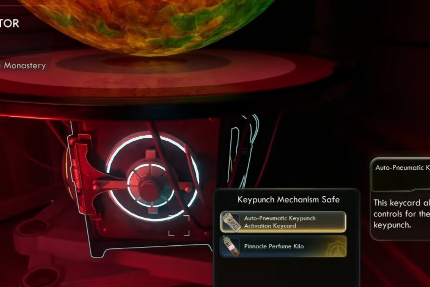 Once the orb reaches its destination, you’ll be able to open the safe below. Inside is the Auto-Pneumatic Keypunch Activation Card—that’s the item you need to stop the press from crushing the victims. The safe also holds a little bonus treat: the Pinnacle Perfume Kilo mod for your inhaler.