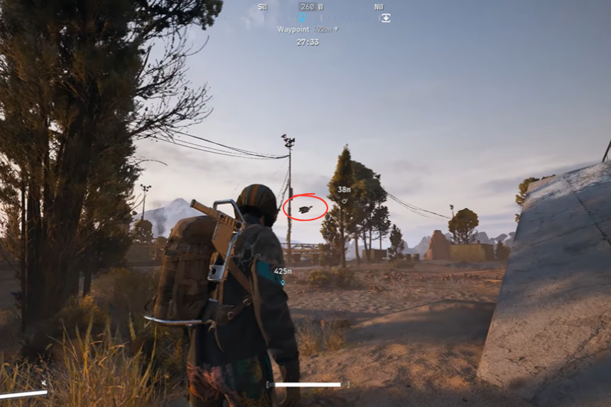 Reach the location marked on the map above. Ping the drones when you see them; their names will show up on screen. If it says “Hornet,” that’s the one you need to destroy.
