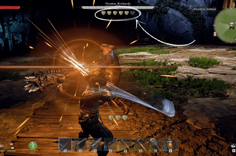 A perfect counter is something you must master, because a perfect counter is going to break the enemy’s poise which is indicated by the shield icons below the enemy name. And when the enemy’s poise is depleted, the enemy will get staggered and you’ll have a brief moment to launch a barrage of attacks and deal as much damage as possible. And also dodging is essential where some attacks cannot be parried, below you’ll find a detailed breakdown of Thomas Richards moveset.