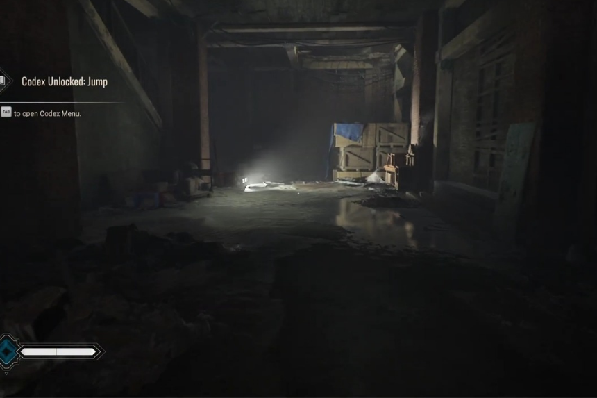 Head right, climb through another hole, and you’ll reach a bright moonlit room with a wide gap. Jump and glide across to the other side, then go through the right-hand door. After a short drop, you’ll land in a hallway patrolled by two officers. Wait for them to walk away, crawl through the low gap in the wall, and drop down again to keep moving.
