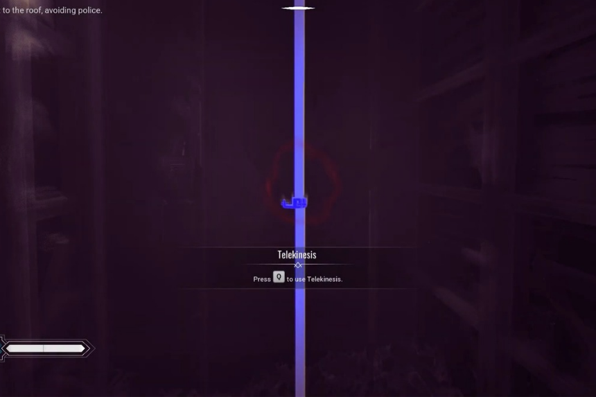Your next stop is the lobby. The front door looks like the way out, but a quick interaction shows that it’s blocked — the police have the place surrounded. Turn right and activate your vampire sight to look around. You’ll notice a faint blue glow coming from a pipe inside the elevator shaft. Use telekinesis to pull it down. The elevator crashes, creating a new opening nearby.