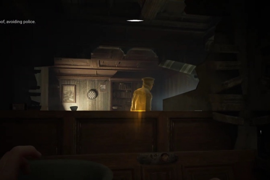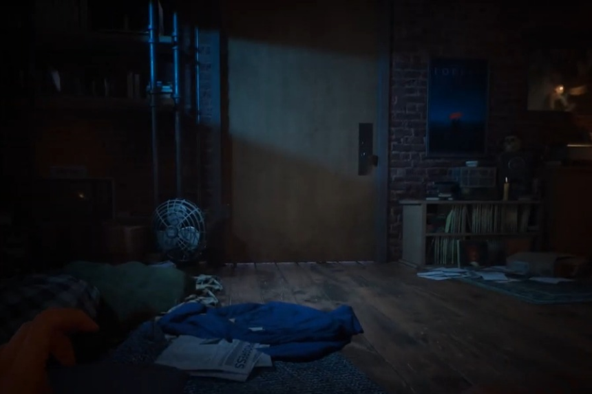 In the next room, look up for a white cloth hanging from a hole above. Interact with it to climb through. In the new space, you’ll find a painting and a radio — they’re small lore bits that talk about what’s happening in Seattle if you take the time to listen.