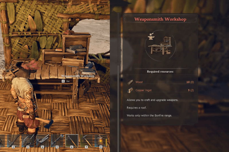 To get started with the weapon upgrades, you first need to set up a Weaponsmith Workshop, and make sure that it’s built under a roof as it’s a requirement to use the weaponsmith workshop.