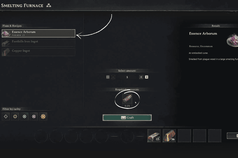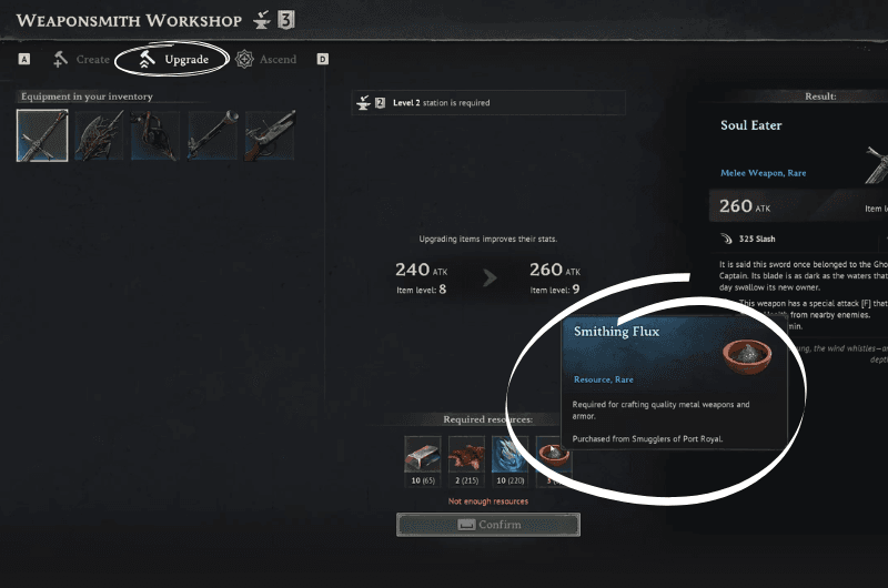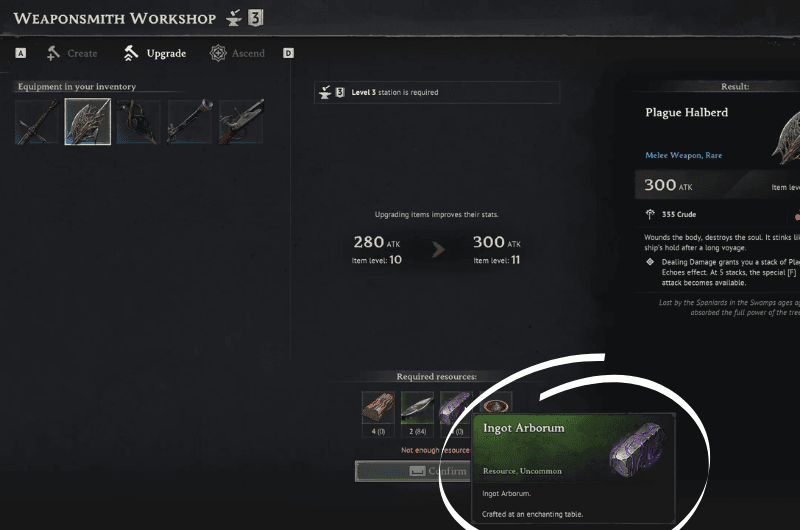 You can upgrade your weapons through the Weaponsmith Workshop under the upgrade tab, weapons that you have equipped currently are shown in this tab. You’re going to need smithing flux, whether to upgrade or create new weapons. Some weapons found in specific biomes require resources from the respective biomes, like the Plague Halberd – you’re going to find this weapon in Cursed Swamps biome and upgrading the weapon requires Ingot Arborum.