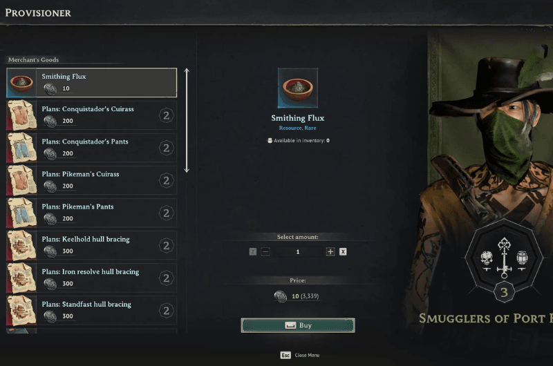You can purchase the Smithing Flux from the provisioner of Smugglers of Port Royale at Tortuga or at the smugglers base.