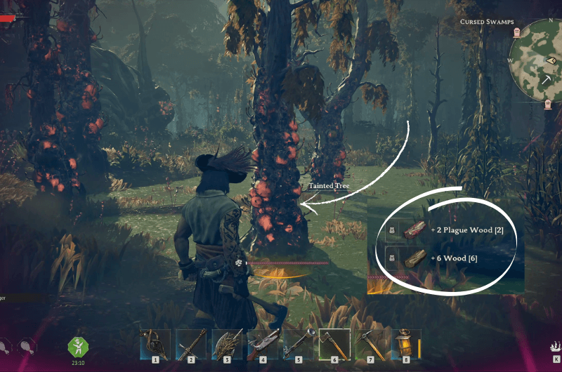 If you scout through the Cursed Swamps, you’ll come across a specific tree called Tainted Tree in the swamps, it looks like it got chicken pox. I’ve shared an image above for your reference. Chop these trees and you’ll obtain the plague wood.