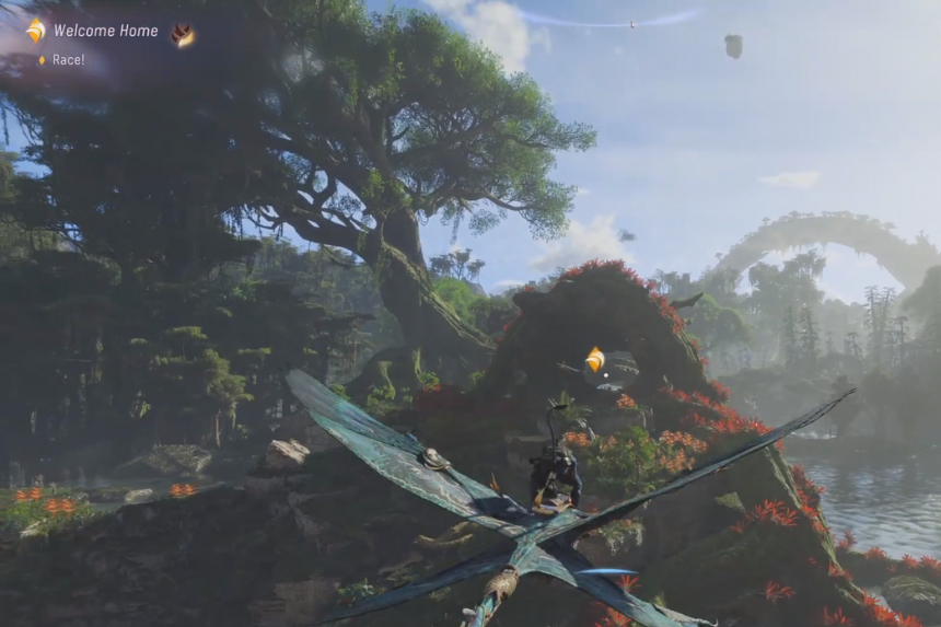 After the vision ends, you will need to race against Sarentu as you fly back to the Hometree on your Ikran. While flying, use the Speed Burst with the X button to gain distance, but make sure to stay close to Sarentu. Watch out for tree branches along the way, and keep following the blue smog trail and the yellow objective marker on your screen so you don’t lose the path.