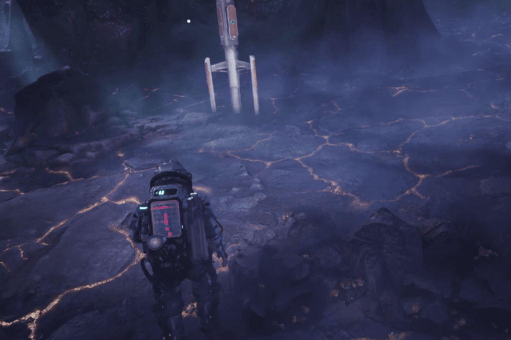 Eventually, you’ll reach an area that looks like scorched ground with glowing yellow cracks almost like it’s made of magma. That’s your spot to pull out your Polygonal Scanner to find the best spot for your Mining Outpost. After placing it, just connect it back to your base using the Pylons, and you’re good to go.